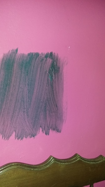 Hola, tienen razón los compañeros, deberías fondear primero las paredes con blanco para eliminar el fondo rosa y luego aplicar el color turquesa.