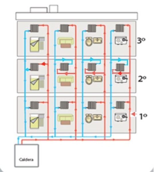 Al instalar los radiadores creo que el constructor se ha equivocado al instalar las entradas de agua caliente y agua fría en parte de los radiadores de la vivienda. Me explico con un par de esquemas adjuntos. La instalación correcta es en las que las columnas siguen un flujo de agua, la incorrecta aquella en la que en varios radiadores la corriente de agua fría y la de caliente chocan en el radiador...