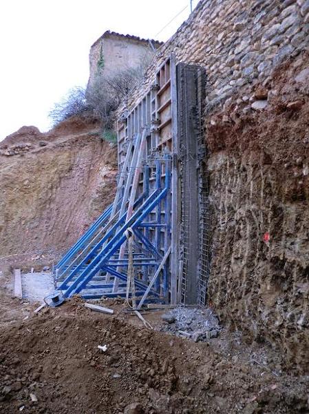 el muro parece tener suficiente compacidad como para permitir la actuación, aunque por seguridad se trabaja por tramos o bataches, es decir se excava un tramo de una longitud determinada se refuerza con el muro adosado y se procede a realizar otro tramo alternativo y después se realizan los espacio intermedios