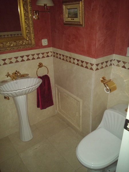 Un aseo que antes era un office de la casa. Para canalizar el agua no sé como se llevó desde ahí hasta la bajante. Yo querria quitar ese baño, cambiandolo por una ducha. Utilizando el mayor espacio posible y aprovechando parte de la instalación previa (hay planchas de marmol de mas de un metro y tuberias de agua preinstaladas).