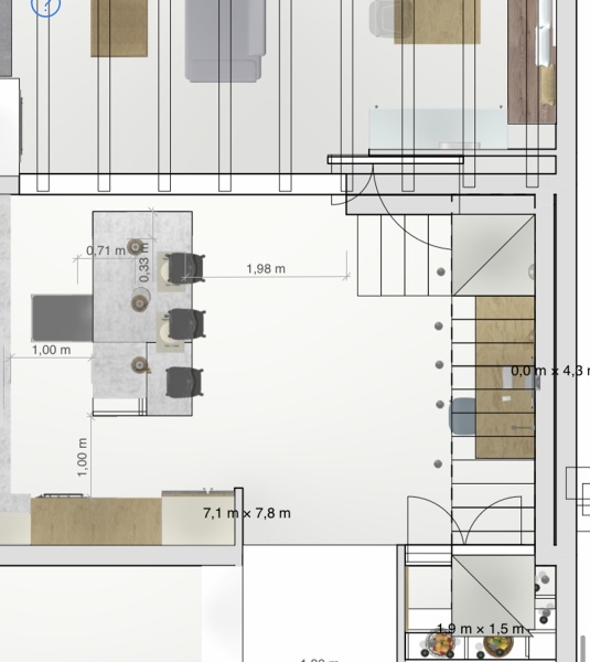 La escalera ocuparía parte de una cocina abierta, entonces, saber el espacio que restaría.