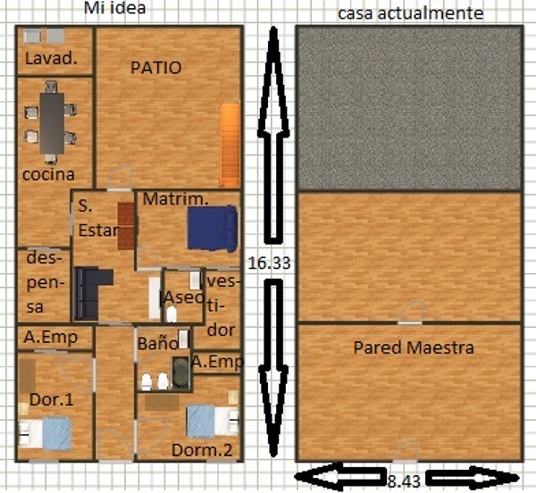 Hola. Tengo una casa antigua para reformar. Me gustaría hacer una reforma íntegra, pero tengo un problema: la casa tiene paredes maestras; una de ellas en el medio y tirarla y reforzar eso creo que encarecerá el presupuesto bastante. Entonces estoy buscando la combinación para distribuir las habitaciones de la mejor manera.