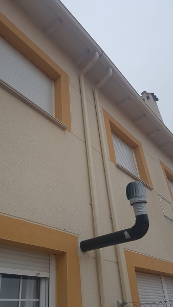 El albañil (que no tiene ni repajolera idea de instalaciones de este tipo) fue a lo fácil y a cobrar... hacer un agujero por debajo del forjado, en la fachada...