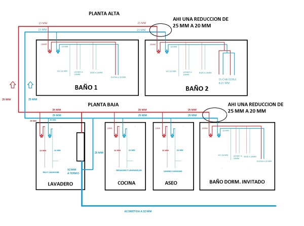 La entrada de agua hasta el termo de 32mm y de ahí sale un ramal de 25mm para agua fría, del termo sale 25mm en caliente y van fria y caliente a 25mm a cada estancia, (aquí es donde tengo la duda) una vez que llegan a las estancias, ¿que sale un ramal de 20mm para hacer la llave de paso? o ¿se hace la llave de paso directamente de la 25mm y a partir de ahí 16 y 20...? uno de los baños de arriba la ducha va doble y seria el ultimo baño de todo el recorrido de arriba. Resumiendo ¿la reducción de 25mm a 20mm que la hago antes o después de la llave de paso? Mi intención es que haya presion en la ducha doble!!