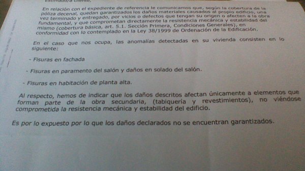 Estimado Javier muchas gracias por su contestación. Cuando contacté con la promotora me dijo que tenia contratado un seguro por lo que iba a tomar contacto con ellos para que nos enviaran un perito. Así fue pero el perito tardó 10 minutos sin poner ningún testigo en las grietas y nos enviaron una contestación que adjunto en foto.