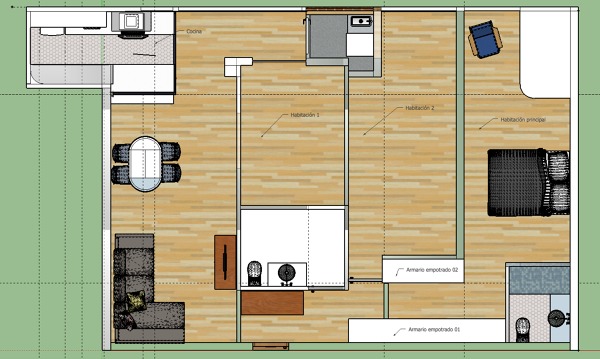 El salón está conectado a la Habitación 1 con una puerta corredera que permanecerá abierta a menudo. Con la canalización me preocupan tres cosas: precio de instalación, limpieza/mantenimiento de los conductos y perder demasiada altura.