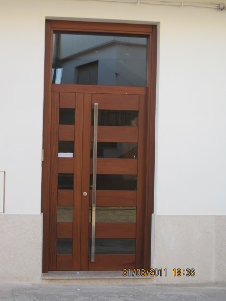 Hola, nuestro taller de fabricación desde donde prestamos nuestros servicios está en Torre del Compte (Teruel). El precio de la puerta en madera de iroko, con vidrio mate ácido de 4 mm., bisagras antipalanca, cerradura de seguridad de 1 punto central Tesa- 4050 Hn y barnizada con barniz sikkens para exteriores es de 2070 € + iva. Aparte habría que sumar la instalación en el caso de que necesiten que se la instalemos en su casa. Adjunto fotos de puertas de entrada de madera de iroko fabricadas por nosotros. Un saludo.