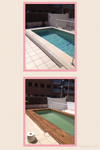 Adjunto fotos de tarima de ipe del antes y el después, instalada y protegida por nosotros en una casa con piscina ubicada a 2 km. del mar.