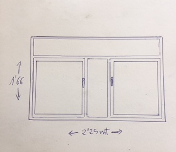 Me gustaría aprovechar y saber vuestra opinión sobre el modelo de ventana que me propone Kommerling, me refiero a la estética, concretamente sobre las dos ventanas mas grandes y en las que necesito mayor insonorización. Me las fabricarían de la siguiente forma: ventana de 166 x 225 cm, con montante fijo, dos travesaños verticales formando tres módulos, el central fijo y los dos laterales con una hoja oscilobatiente cada uno (como el dibujo de acontinuación).