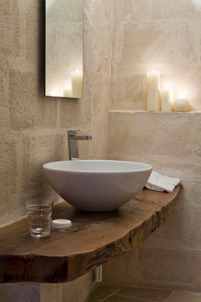 Este tipo de encimeras suelen se fabricadas a medida. No es mas que una encimera de madera rustica o tronco aserrado en el cual se coloca el lavabo, en el caso de la foto un lavabo sobre encimera.