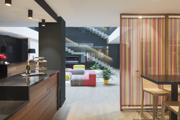 Respecto a la imagen, sí que són cuerdas. En concreto, son de algodón teñido para seguir los tonos de los sofás del vestíbulo. Era una forma senzilla y económica de separar dos espacios sin hacerlos pequeños y cerrados. Por cierto, a los niños les encanta!