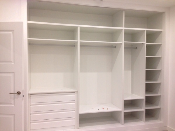 1- Forrar armario y poner 2 puertas correderas 150x220 cm con 1 cajonera, baldas, barra de colgar, maletero. 1.700€ aprox. + 150 € si hay que desinstalar y reciclar el antiguo.